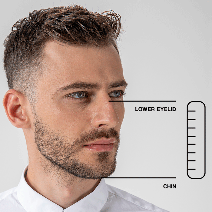 Pokud je vzdálenost mezi dolním víčkem a bradou na hranici velikostí, vyberte větší velikost, aby lépe seděla. Respirátor můžete vždy upravit.