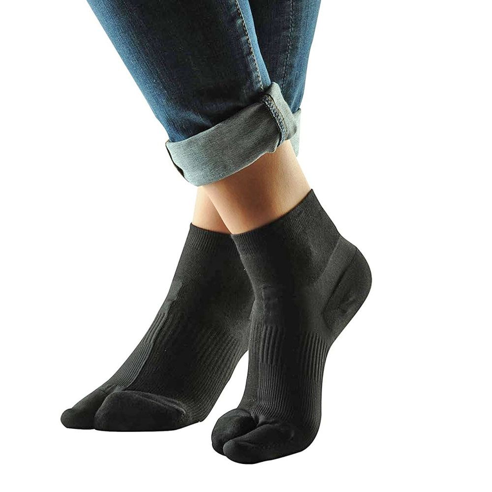 Tyto ponožky pracují jako integrovaná ortéza – jemný tah podél chodidla a přes střední část nártové kosti zajišťuje stabilitu a pomáhá korigovat polohu palce.