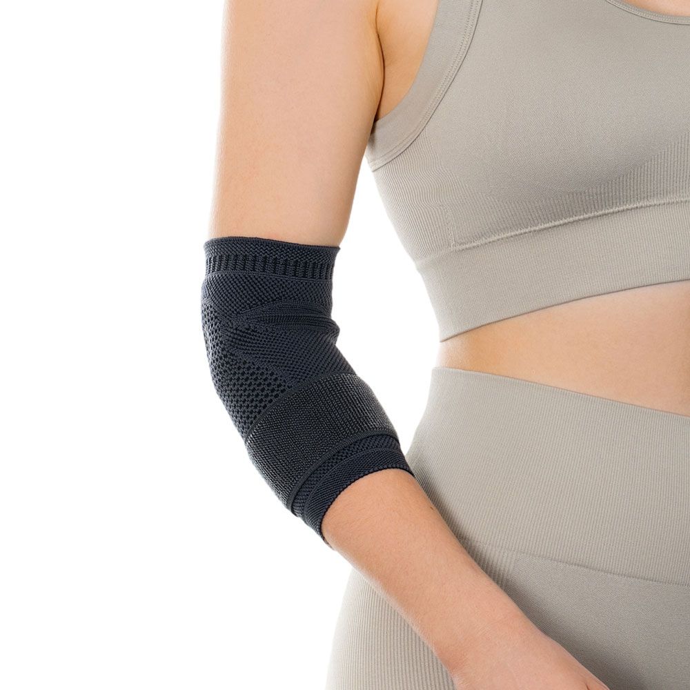 Anatomicky tvarovaná loketní bandáž s inovativními silikonovými pelotami a epikondylární páskou pro maximální pohodlí a terapeutické výsledky.