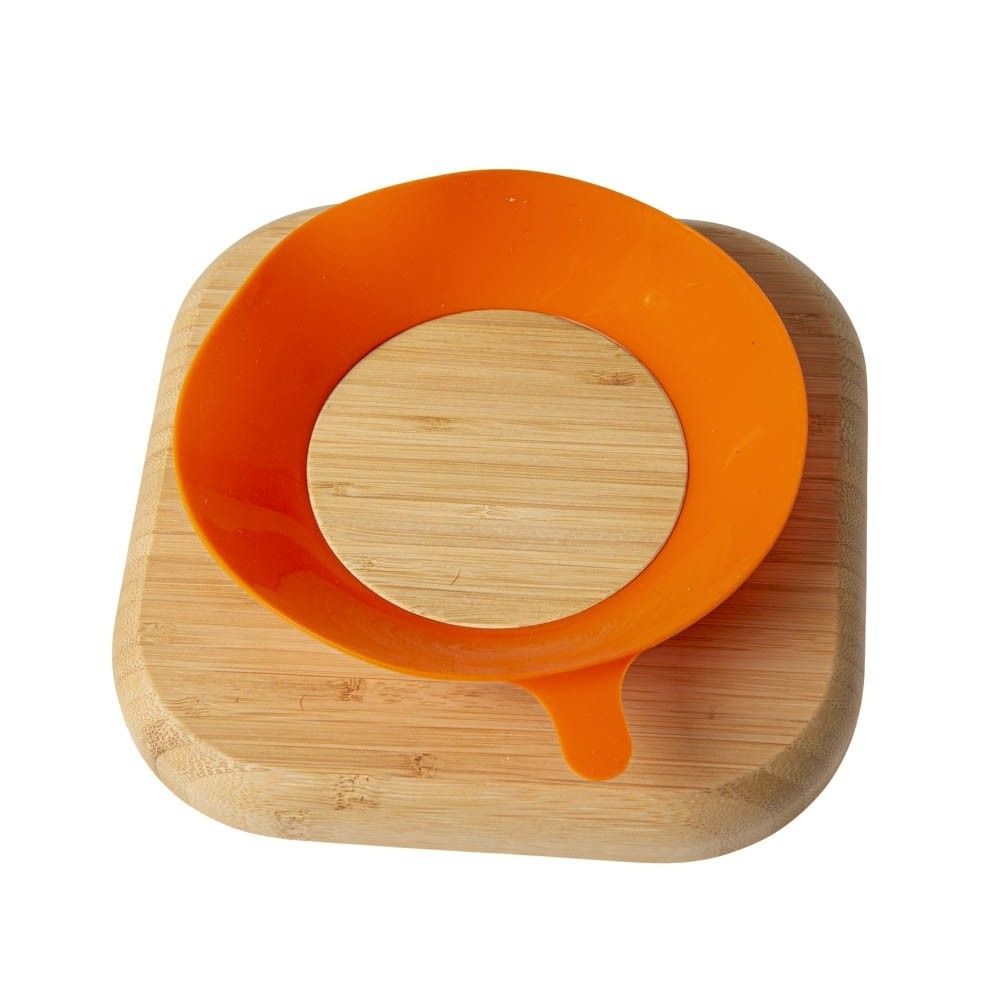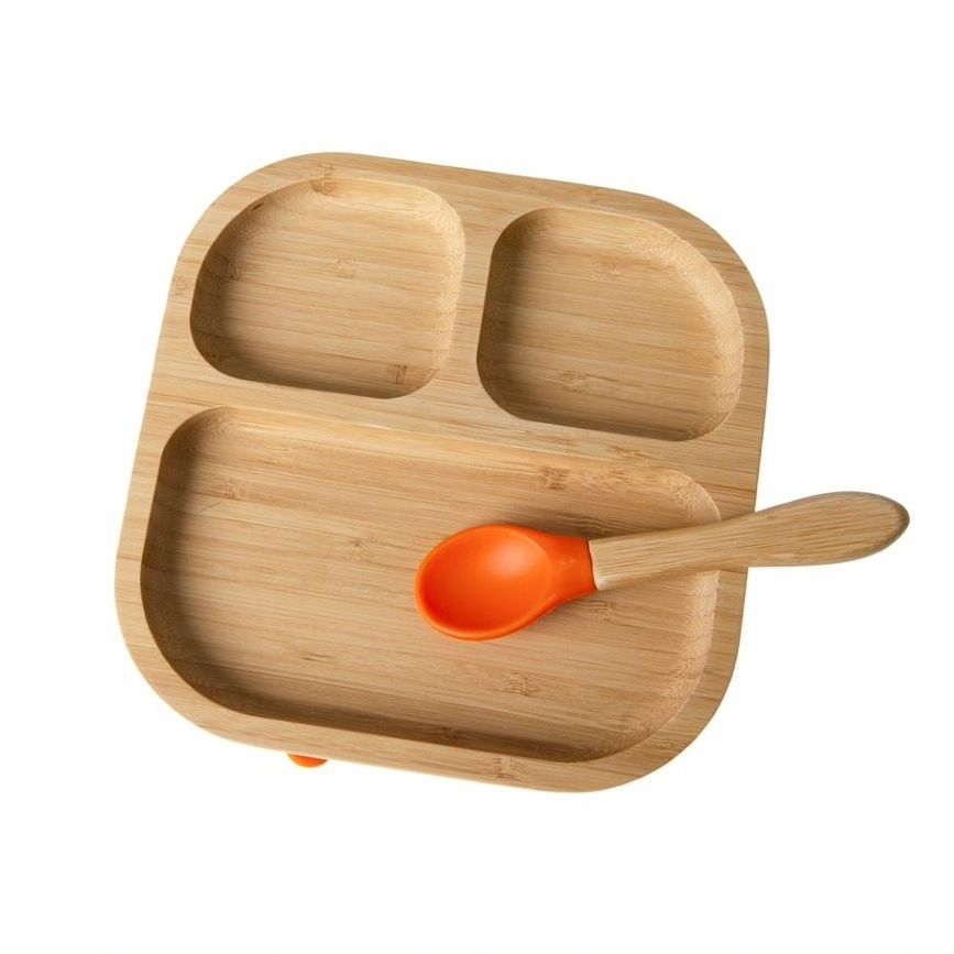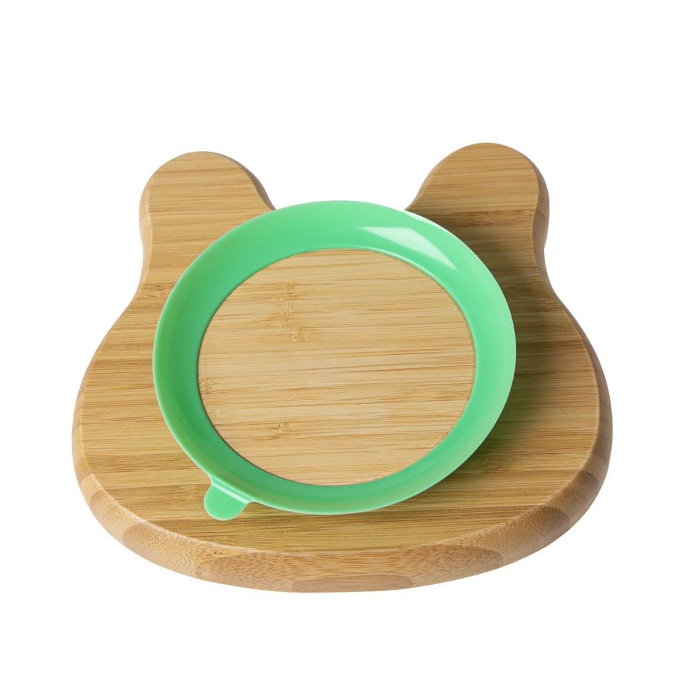 Je vyroben z lehkého ale velmi odolného bambusu s protiskluzovým silikonovým lemem, pomocí kterého lze talířek přisát ke stolu. Lžička je také kombinací bambusu a silikonu, který je hygienický a měkký.
