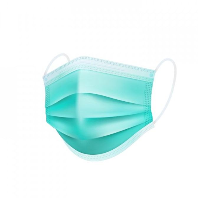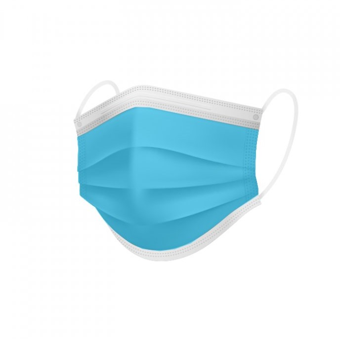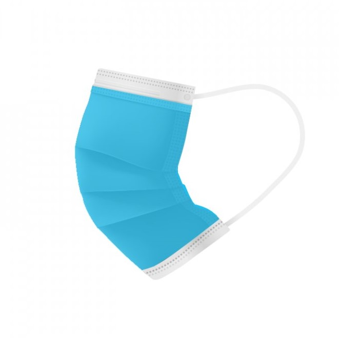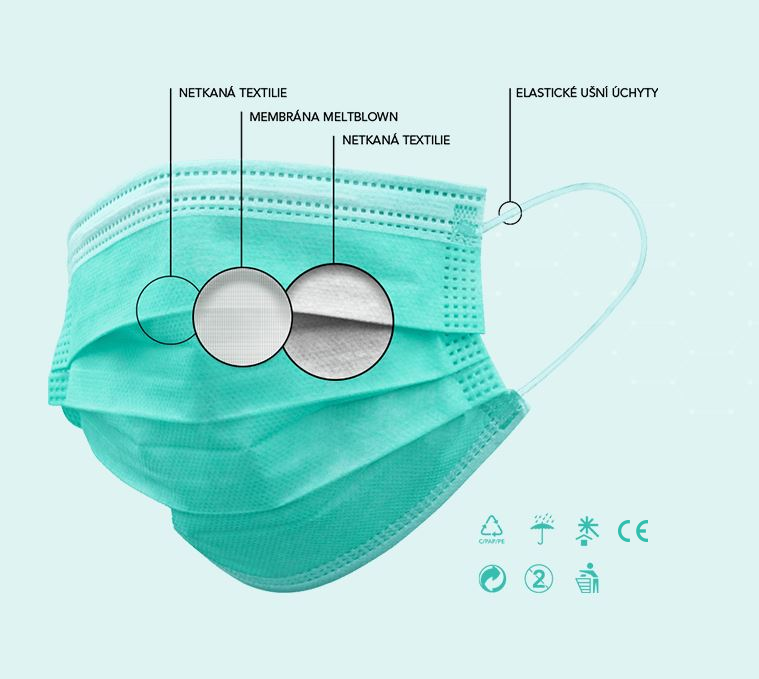 Jednorázové 3-vrstvé roušky z měkké vodu odpuzující netkané textilie, s gumičkami za ucho, s nosním tvarovatelným třmínkem pro optimální přizpůsobení obličeji.