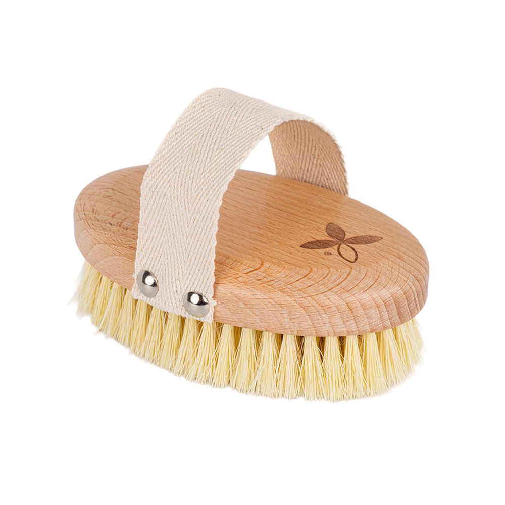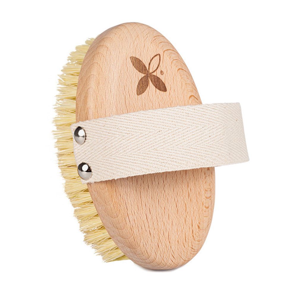 Kvalitní kartáč na suché masáž těla vyrobený výhradně z přírodních materiálů. Leštěná buková základna, pevný bavlněný popruh pro pohodlné držení a hustě osazené 100% rostlinné štětiny Tampico z agáve.