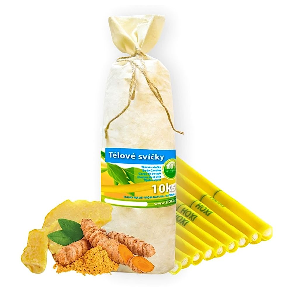 Tělové svíce HOXI vyrobeny ze 100% bavlněného plátna, včelího vosku, protizánětlivé kurkumy a esenciálních olejů