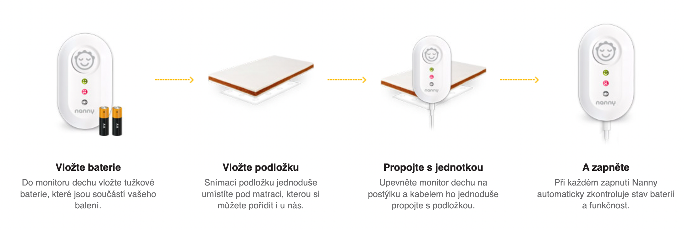 Instalace Nanny je velmi snadná a rychlá. Monitor dechu nevyžaduje také žádný speciální servis. A navíc díky vysoké životnosti baterií je obvyklé, že je vkládáte jen jednou, a to při prvním spuštění Nanny.