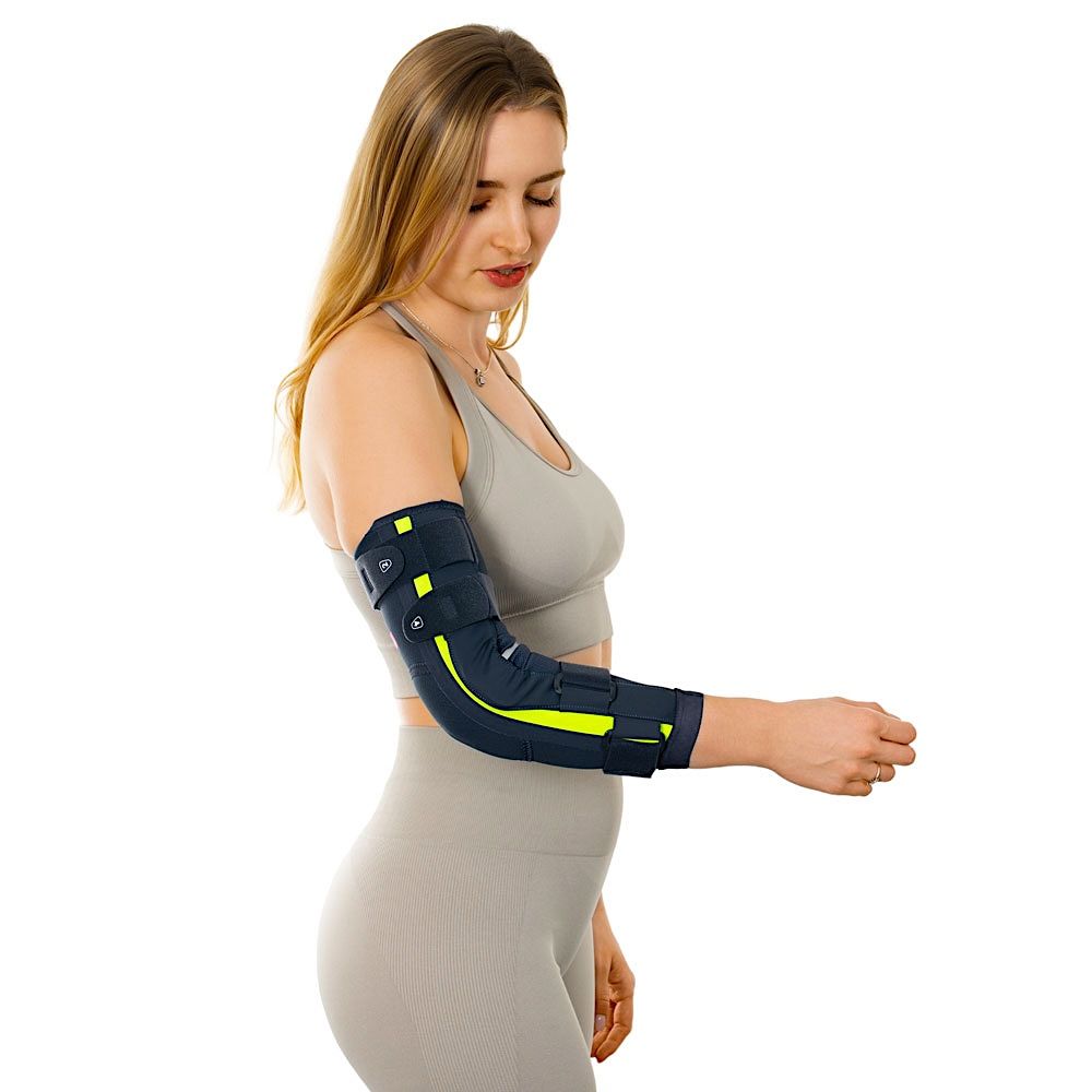 Lakťová ortéza s obmedzením extenzie a/alebo flexie.