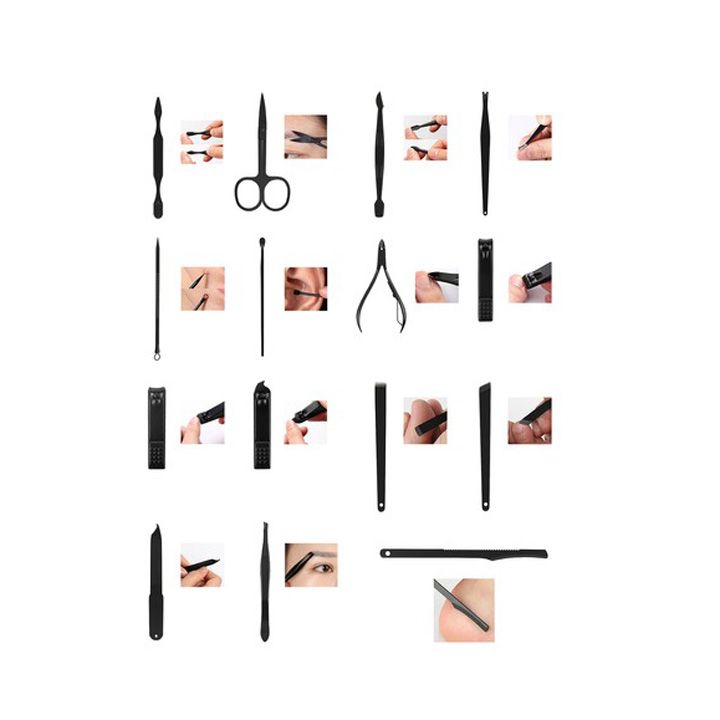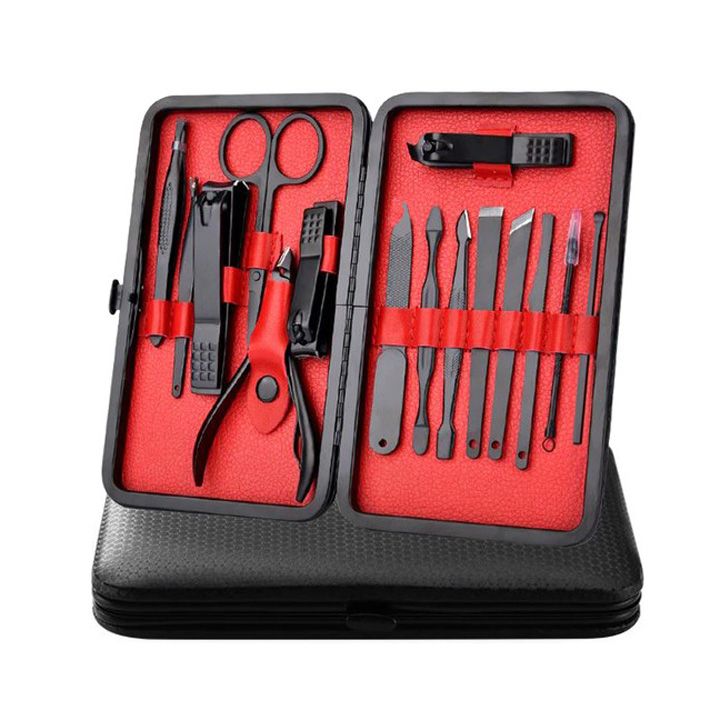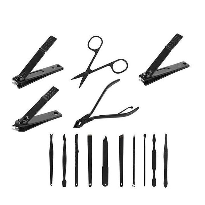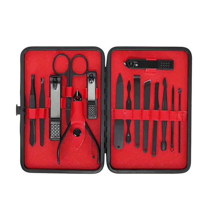 Manikúrní sada 16 dílná sada z kartáčované černé oceli v uzavíratelném koženém pouzdru.