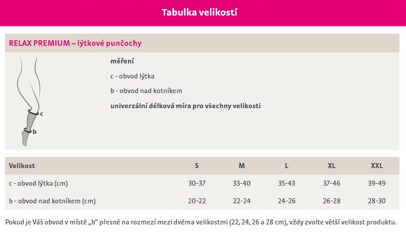Punčochy RELAX PREMIUM jsou nedílnou součástí prevence žilních a lymfatických onemocnění a kompresivní léčby. Mají odzkoušený gradient sestupu tlaku od kotníku směrem vzhůru. Vyvíjený tlak výrazně napomáhá cirkulaci krve v nohou. Punčochy RELAX PREMIUM pomáhají předcházet vzniku cestovní trombózy, jsou vhodné při dlouhodobém sezení a stání, po lymfodrenáži anebo po kosmetickém zákroku na rozšířených kožních žilkách (pavoučí žíly – metličky).