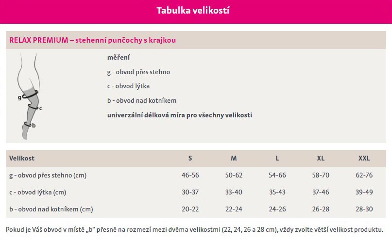 Punčochy RELAX PREMIUM jsou nedílnou součástí prevence žilních a lymfatických onemocnění a kompresivní léčby. Mají odzkoušený gradient sestupu tlaku od kotníku směrem vzhůru. Vyvíjený tlak výrazně napomáhá cirkulaci krve v nohou. Punčochy RELAX PREMIUM pomáhají předcházet vzniku cestovní trombózy, jsou vhodné při dlouhodobém sezení a stání, po lymfodrenáži anebo po kosmetickém zákroku na rozšířených kožních žilkách (pavoučí žíly – metličky).