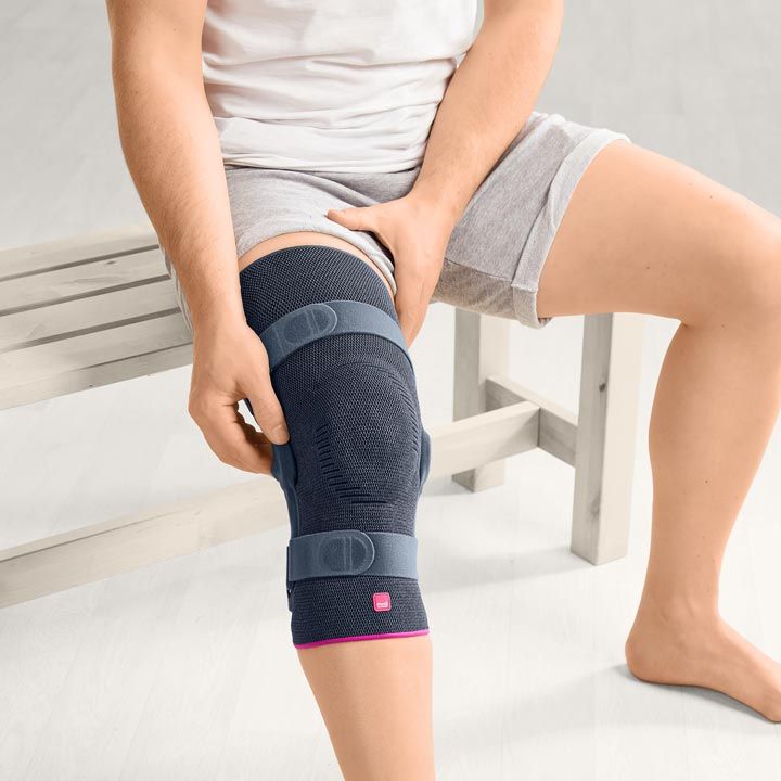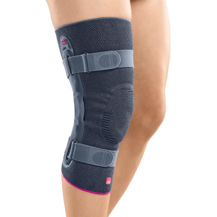 Lehká anatomická úpletová aktivní kolenní ortéza s postranními plastovými dlahami a antibakteriální úpravou. Moderní dvouosý kolenní kloub z plastu, zvýšená podpora pomocí suchých zipů na stehně a pod kolenem. Horní část stehna je pokryta silikonovými nopky a zabraňuje klouzání ortézy.