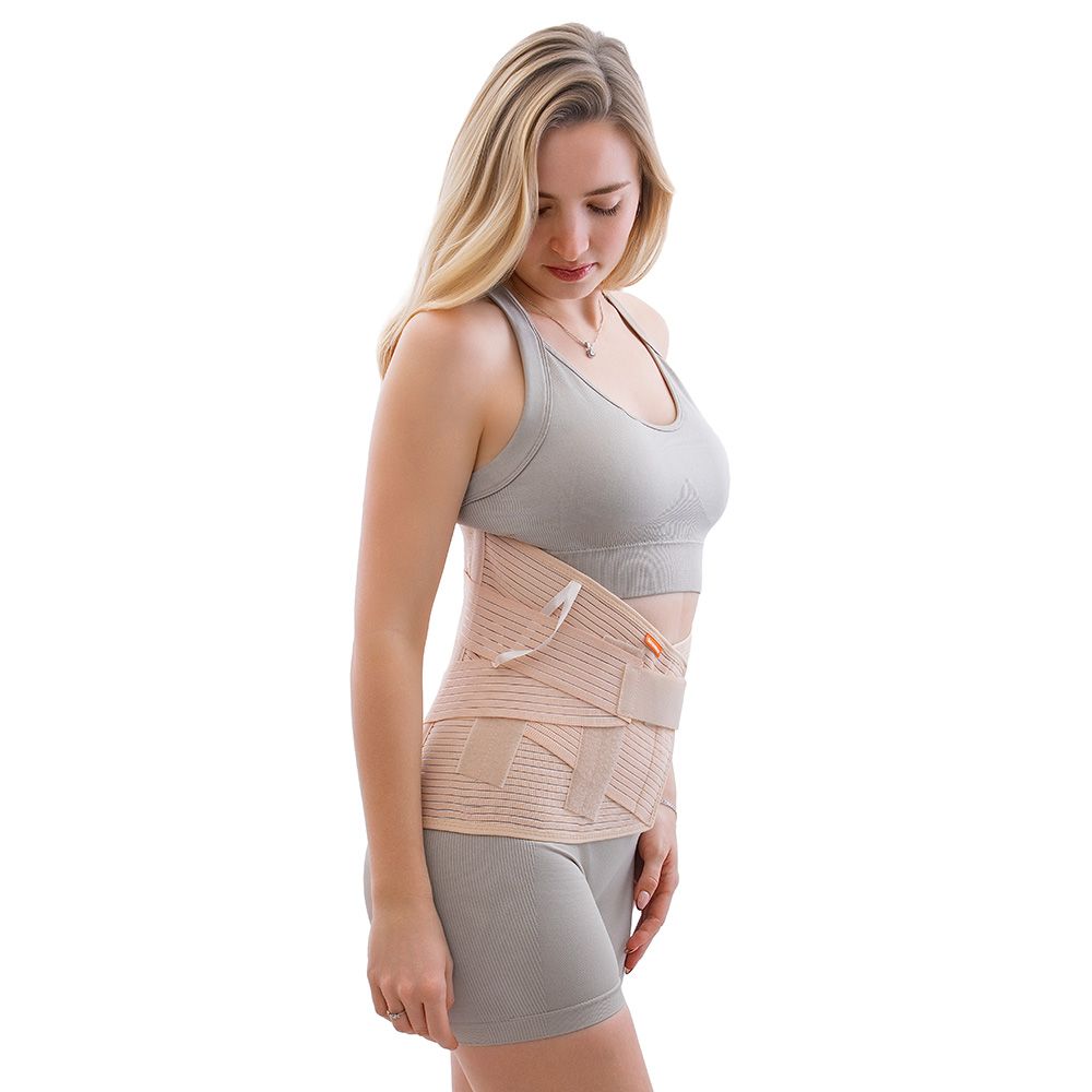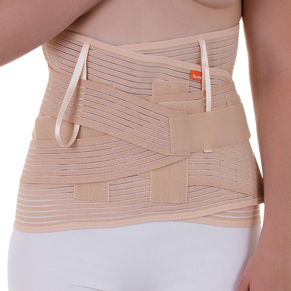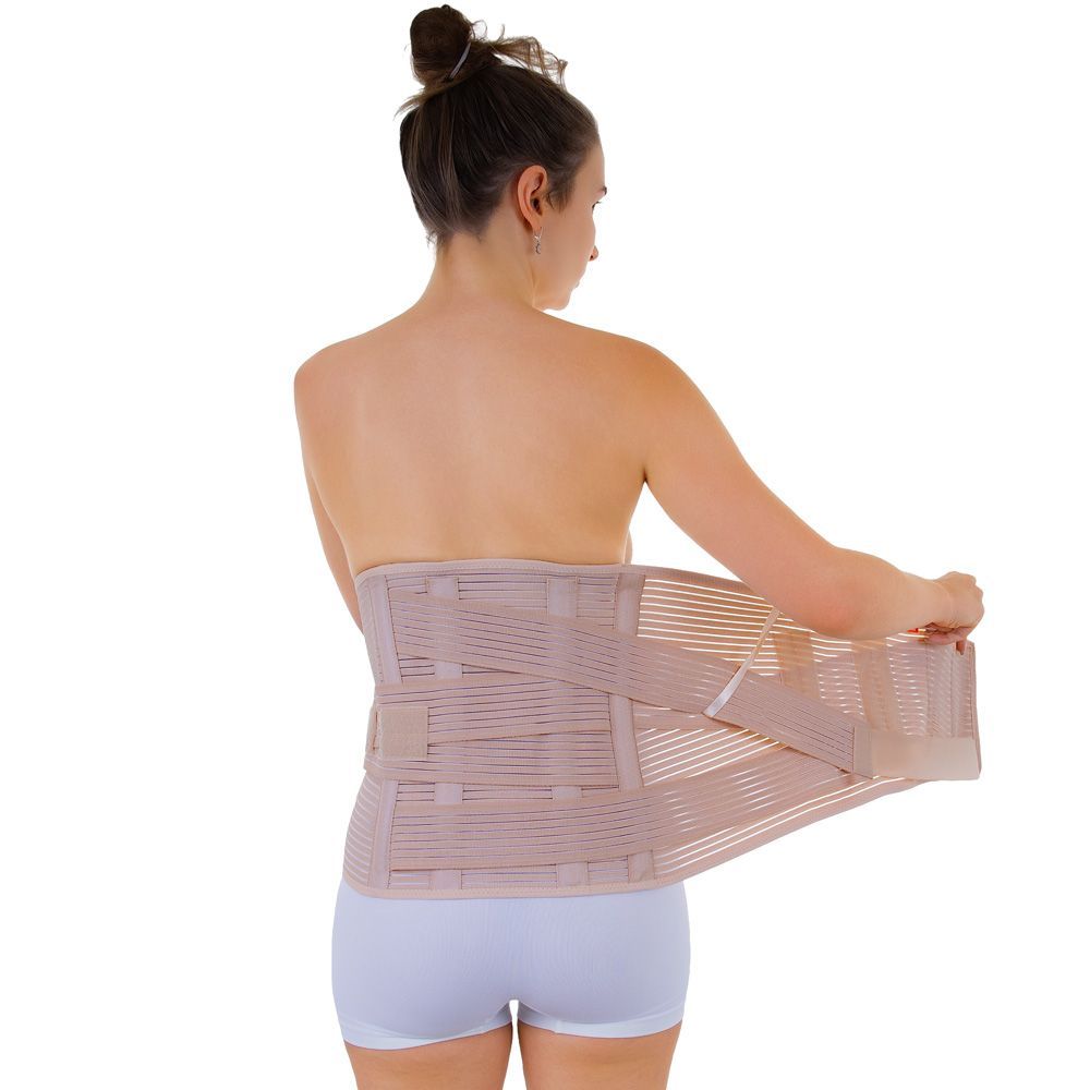 Pás je vyroben z pružného elastického materiálu. Pás nasadíme tak, aby dlahy byly na zádech symetricky usazeny, pak pás na břiše zapneme.