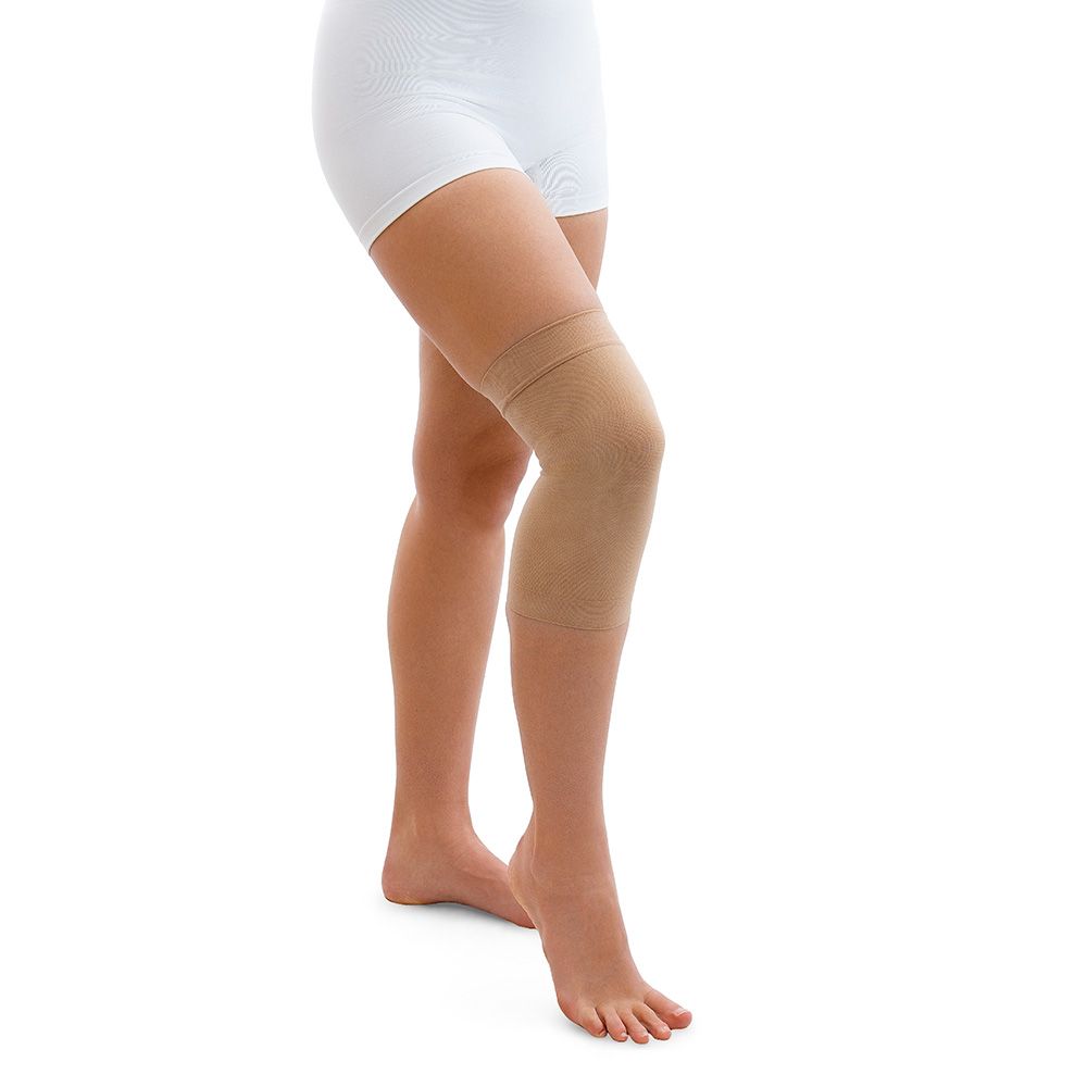 Lehká elastická bandáž kolene z prodyšného úpletového materiálu pro příjemný pocit na kůži.