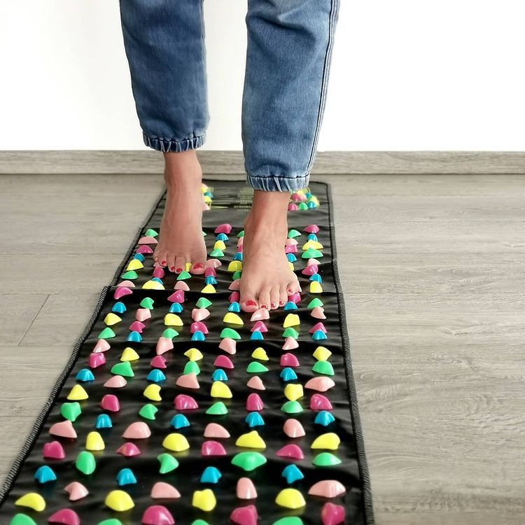 Akupresurní podložka splní účel domácí masáže chodidel. Podložka je poseta barevnými kamínky, které vyplňují obrysy chodidel. Pozice kamínků odpovídá bodům, které stimulují nebo naopak uklidňují určité orgány a části těla. Díky reflexní masáži podporujete cirkulaci krve ve Vašem těle. Akupresurní kamínková podložka pomáhá posilovat také Vaší imunitu, ulevuje při bolestech zad a hlavy.