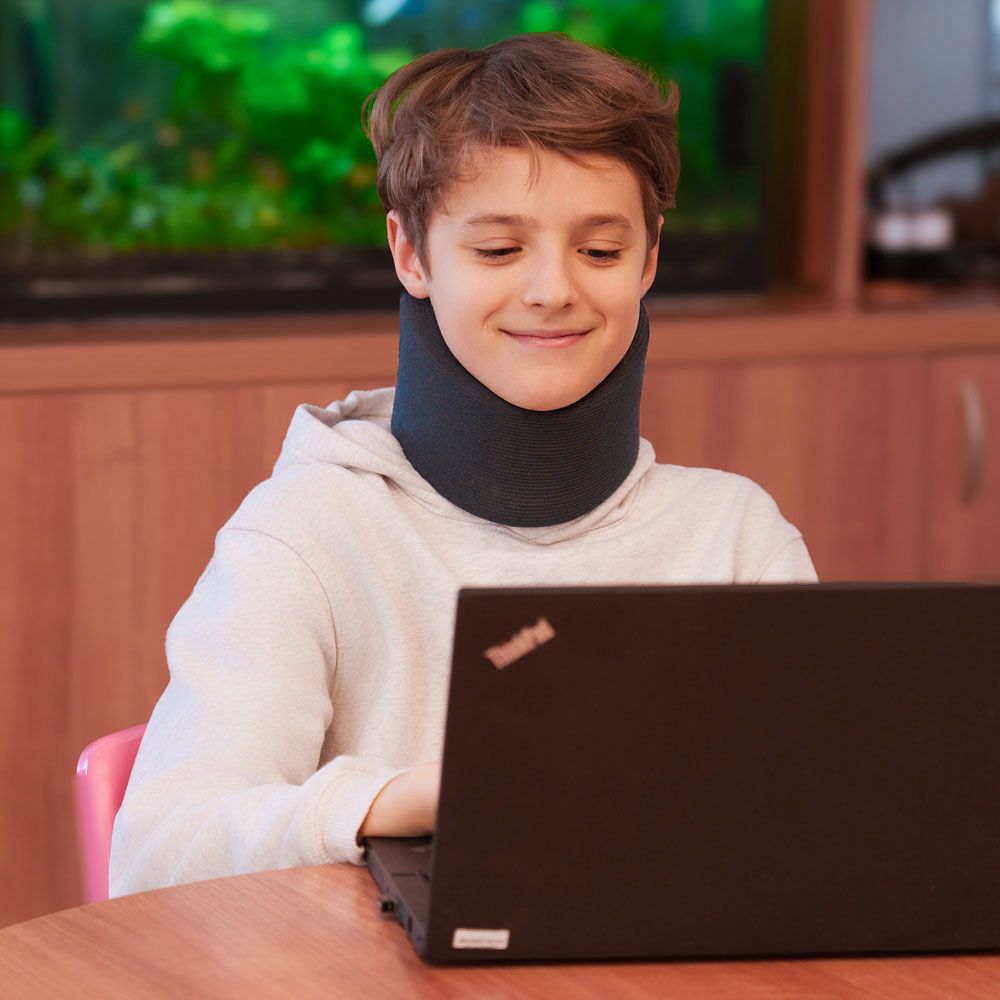 Anatomicky tvarovaný dětský krční límec z pěnového materiálu, potažený bavlněným úpletem. Je lehký, pevný, se snadnou aplikací. Zapínaní vzadu na suchý zip.