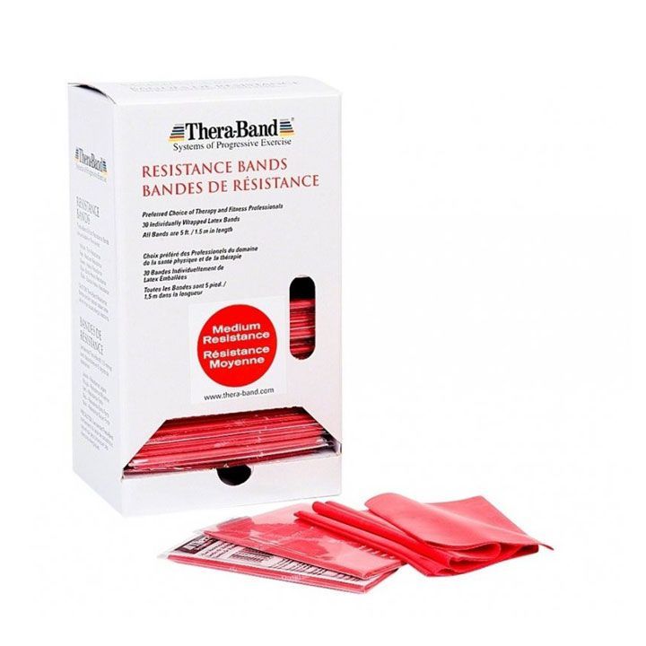 Středně silný červený pás je vhodný pro rehabilitaci, ženy, lehké posilování, aerobic nebo trénované starší osoby.