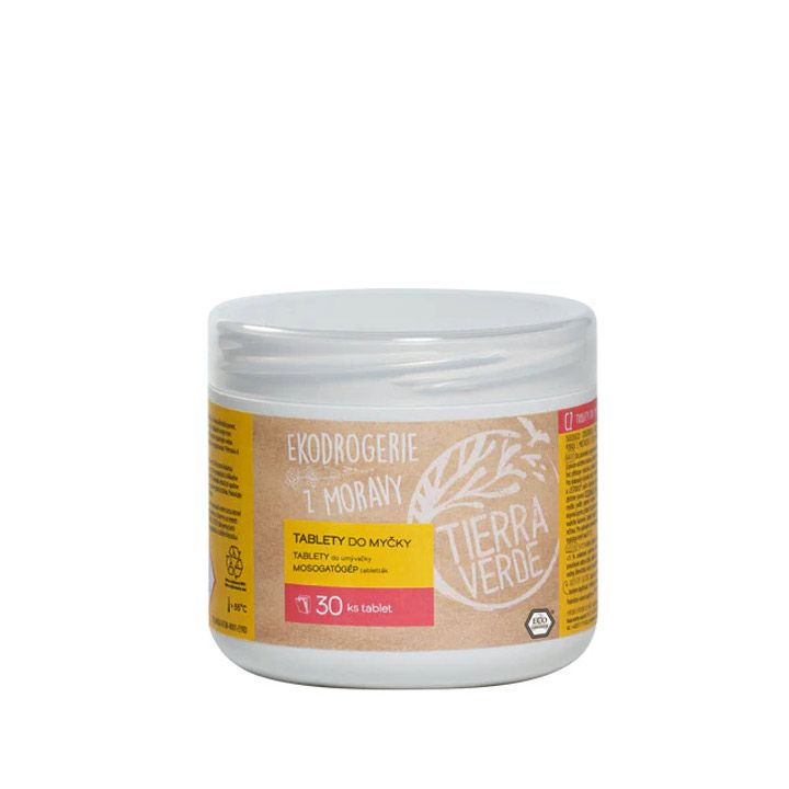 Tierra Verde Tablety do myčky -po více než ročním testování Tierra Verde vyvinula mimořádně šetrné tablety do myčky, které neobsahují enzymy, fosfáty, fosfonáty, parfémy ani barviva. Tyto tablety účinně odstraňují zaschlé zbytky jídla a mastné skvrny, přičemž jsou snadno odbouratelné v přírodě. Hlavními aktivními složkami jsou uhličitan sodný (prací soda) a křemičitan sodný, které společně s inovativními tenzidy a perkarbonátem sodným vypulírují kuchyňské náčiní k dokonalosti. Stejně jako všechny prostředky do myčky od značky Tierra Verde, i tyto tablety splňují kritéria prestižního evropského certifikátu Ecogarantie®.