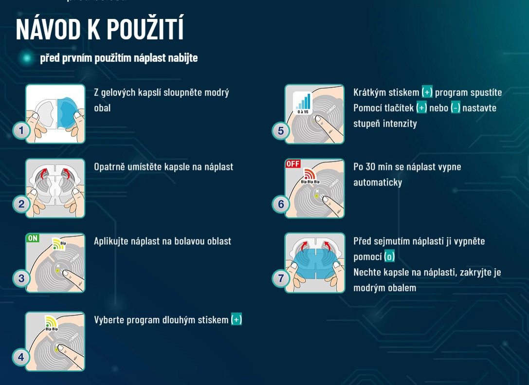 Urgo elektroterapeutická náplast efektivně zmírňuje bolest zad, svalů a kloubů a nervovou bolest bez nežádoucích účunků. Náplast působí díky technologii TENS (transkutání elektrická nervová stimulace). K dispozici je 5 programů, každý má 15 stupňů intenzity a trvá 30 minut. Jedná se o dobíjecí náplast.